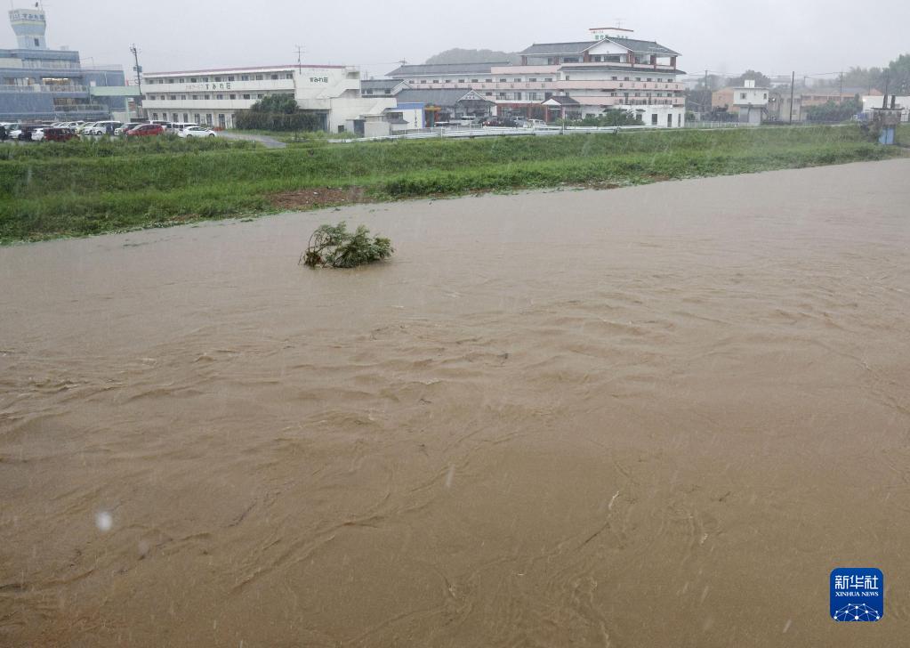 7月10日,日本福岡縣飯冢市一條河流河水上漲。