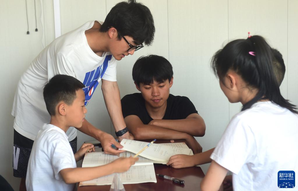 7月10日,在河北滄州,兩名大中專(zhuān)學(xué)生志愿者為董林村學(xué)生輔導作業(yè)。