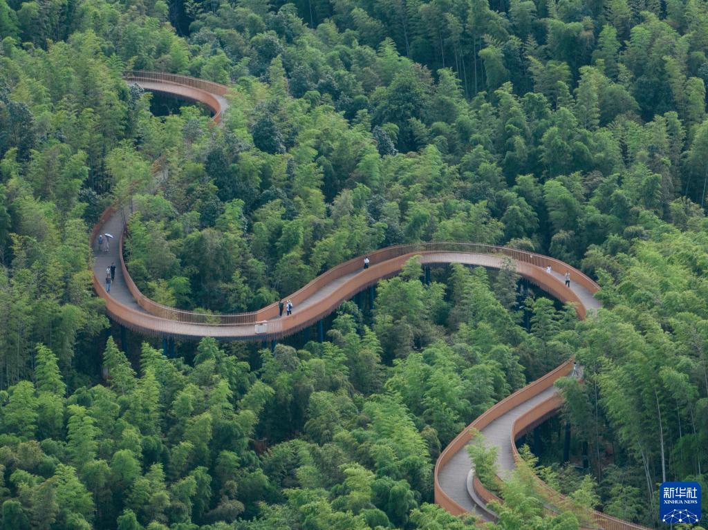 游客在四川省宜賓市蜀南竹海的竹尖漫步步行走廊上散步,享受綠意(6月30日攝,無(wú)人機照片)。