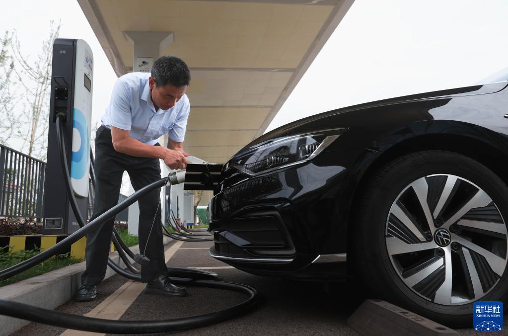 一位駕駛員在四川省宜賓市三江新區東部產(chǎn)業(yè)園能源港的光伏雨棚下為新能源汽車(chē)充電(6月29日攝)。