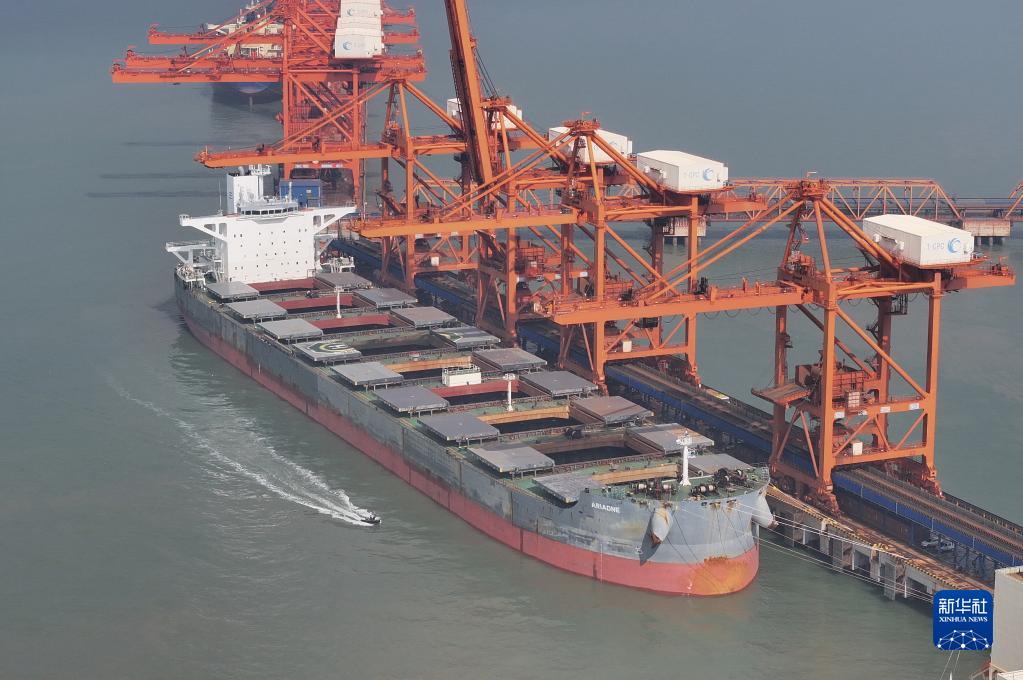 7月10日,一艘輪船靠泊在唐山港曹妃甸港區礦石碼頭卸載(無(wú)人機照片)。