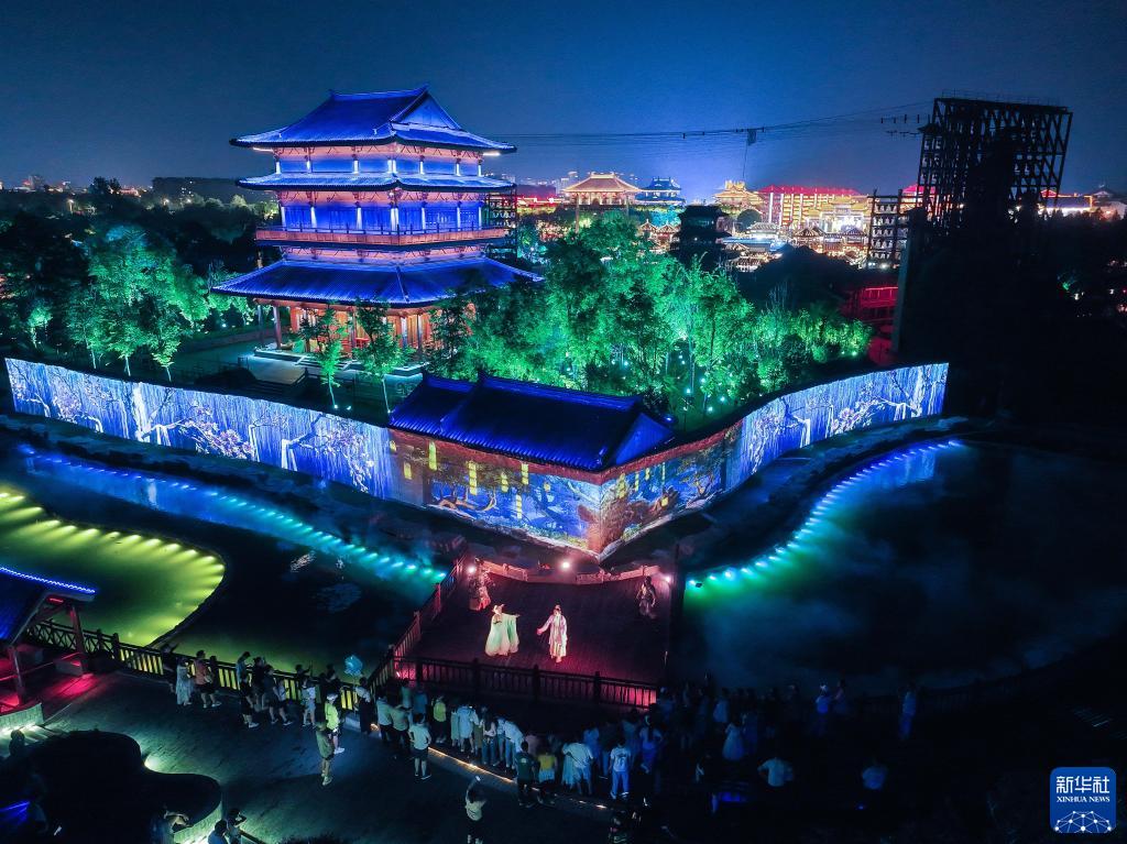 7月9日,在江蘇東臺西溪天仙緣景區,觀(guān)眾在觀(guān)看行進(jìn)式夜間游園演出《尋仙緣》(無(wú)人機照片)。