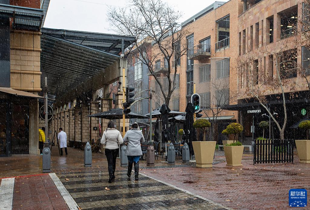 7月10日,在南非約翰內斯堡一處商業(yè)區,人們在雪中行走。