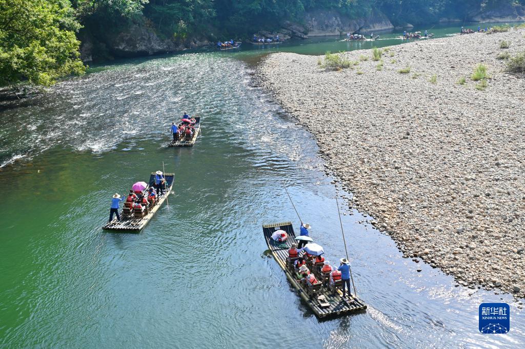 7月10日,在福建武夷山國家公園,游客乘竹筏漂流。