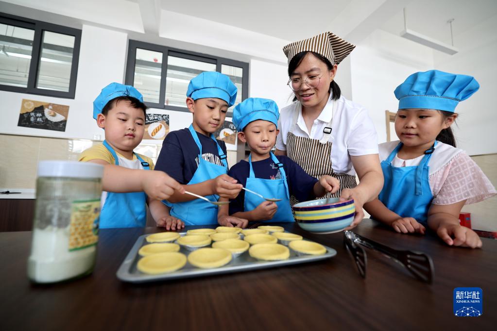 7月10日,在河北省石家莊市復興大街小學(xué),小學(xué)生在老師的指導下進(jìn)行面點(diǎn)制作。