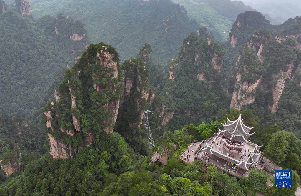 7月10日,游客在張家界國家森林公園黃石寨游覽(無(wú)人機照片)。