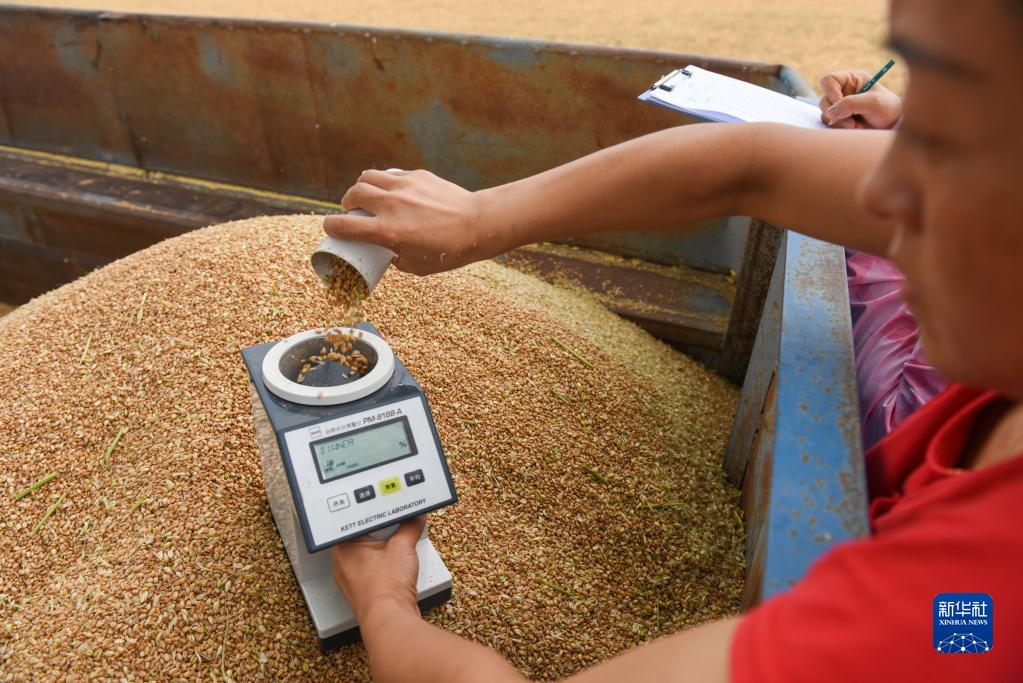 7月10日,在石嘴山市平羅縣姚伏鎮,農業(yè)工作者對小麥進(jìn)行水分測量。