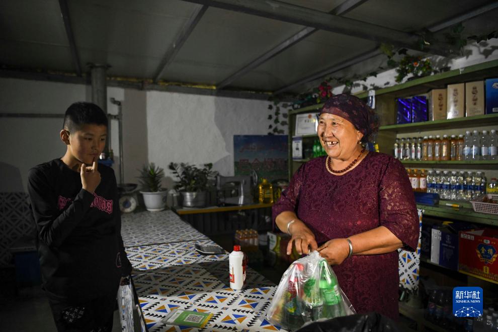 巴哈提在家中給前來(lái)買(mǎi)東西的顧客打包商品(7月2日攝)。與父輩們單一的放牧不同,巴哈提家的收入來(lái)源日益多元化。