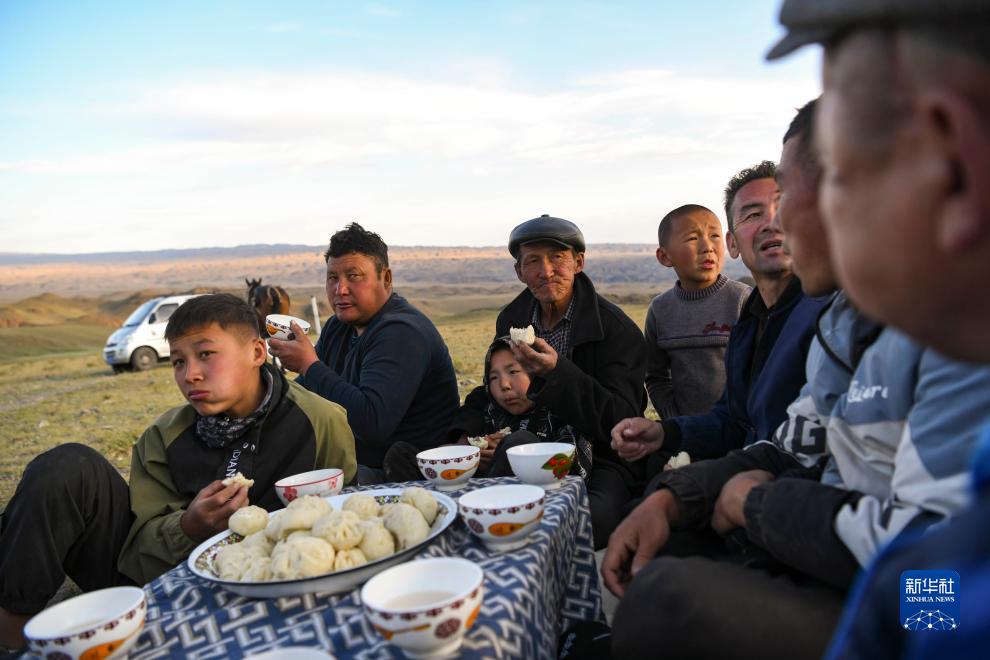 轉場(chǎng)隊伍抵達第一天的露宿營(yíng)地后,哈布得拉什么(左三)和親人們一起席地而坐吃晚飯(7月3日攝)。