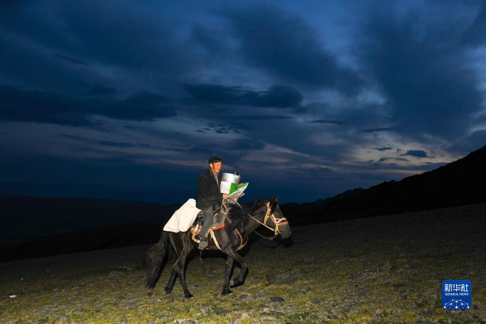 由于坡度太大,汽車(chē)無(wú)法攜帶物品抵達露宿營(yíng)地,哈布得拉什么只好騎馬轉運(7月3日攝)。
