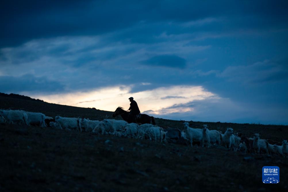 轉場(chǎng)第二天清晨,哈布得拉什么迎著(zhù)霞光,騎馬清點(diǎn)羊的數量(7月4日攝)。