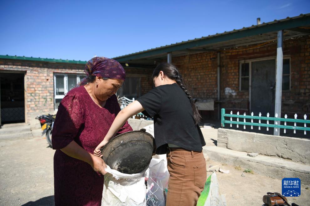 巴哈提(左)和小女兒昆樹(shù)阿克一起打包在夏牧場(chǎng)做飯需用的鍋碗等物品(7月3日攝)。