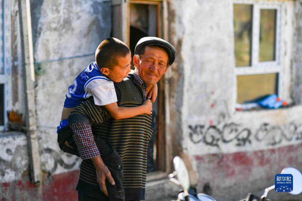 轉場(chǎng)出發(fā)前,哈布得拉什么背著(zhù)小外孫巴哈卓力玩耍(7月3日攝)。轉場(chǎng)時(shí),親友們前來(lái)幫忙,也是一次難得的短暫相聚。