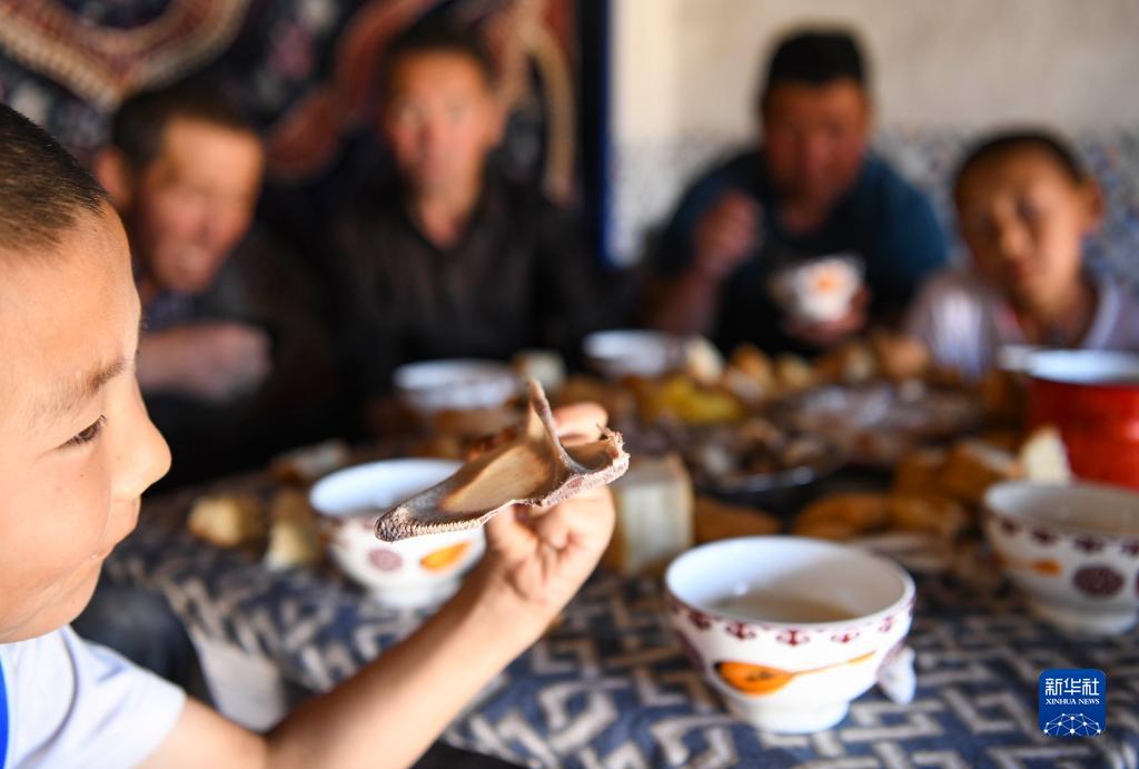轉場(chǎng)出發(fā)前的聚餐上,一名小朋友拿起一塊羊的肩胛骨玩耍。按習俗,負責削肉的親人會(huì )在骨頭上切開(kāi)三角豁口,寓意“前路平坦,此行平安”(7月3日攝)。