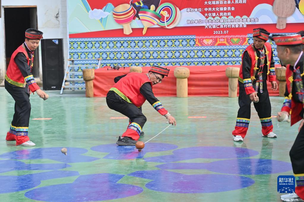 7月11日,在大化瑤族自治縣仁良村,村民在陀螺文化展演活動(dòng)中打陀螺。