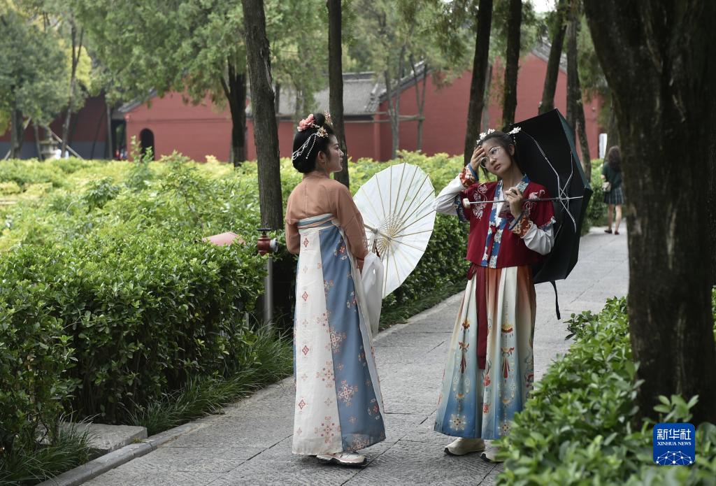 7月11日,身穿古裝的游人在洛陽(yáng)市白馬寺景區游覽。