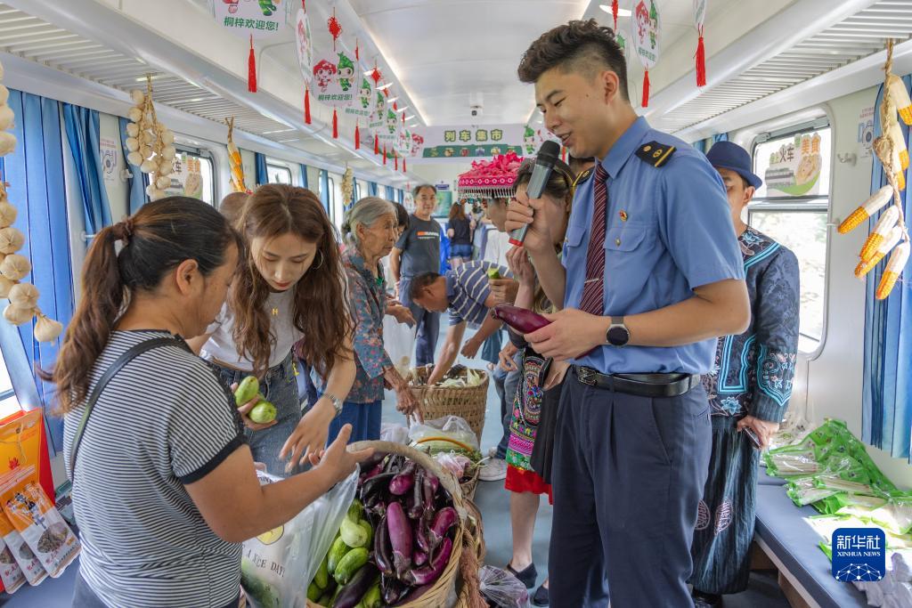 7月11日,旅客在5630次列車(chē)上的“列車(chē)集市”購買(mǎi)農產(chǎn)品。