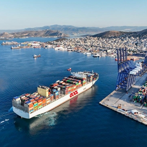 “東方比雷埃夫斯”號大型集裝箱船10日抵達希臘最大港口比雷埃夫斯。港方以“水門(mén)禮”歡迎這艘近400米長(cháng)的集裝箱船首航掛靠比港?!皷|方比雷埃夫斯”號長(cháng)399.9米,寬61.3米,可裝載24188個(gè)標準集裝箱,是世界上最大的集裝箱船之一。