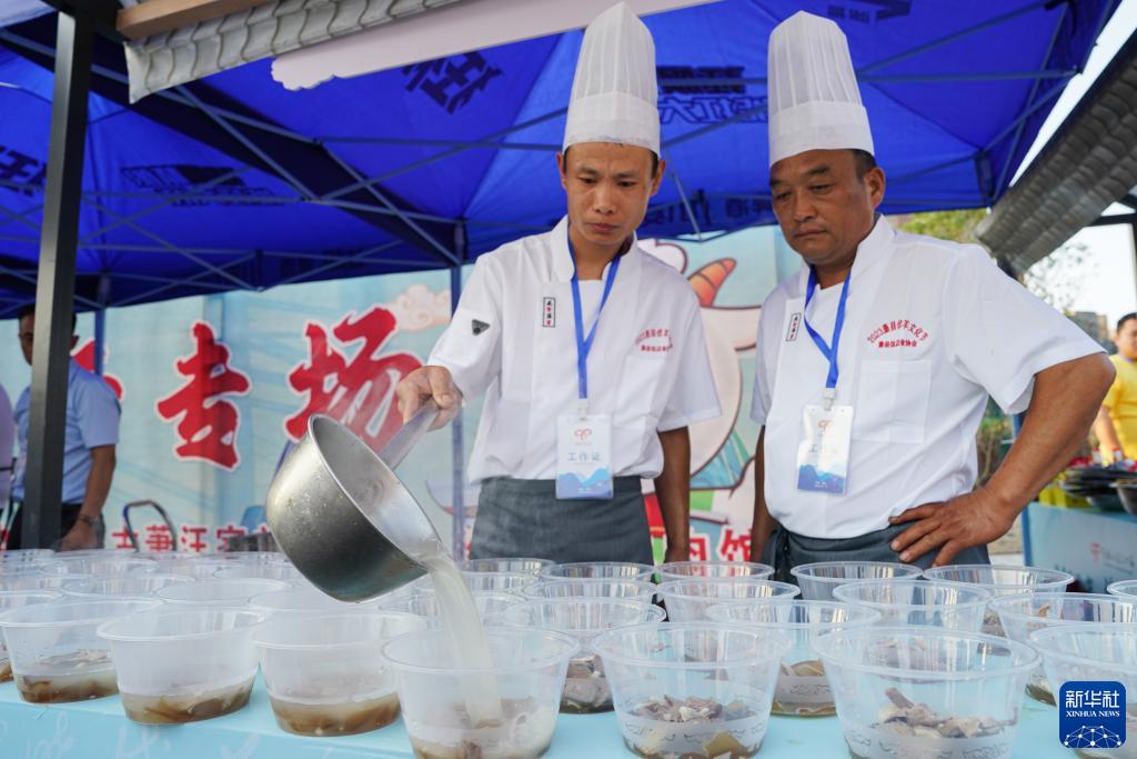 7月11日,在安徽省宿州市蕭縣水墨圣泉古鎮廣場(chǎng),廚師分裝羊湯。