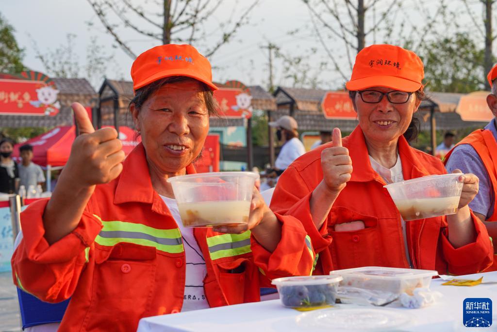 7月11日,在安徽省宿州市蕭縣水墨圣泉古鎮廣場(chǎng),環(huán)衛工人品嘗羊湯。