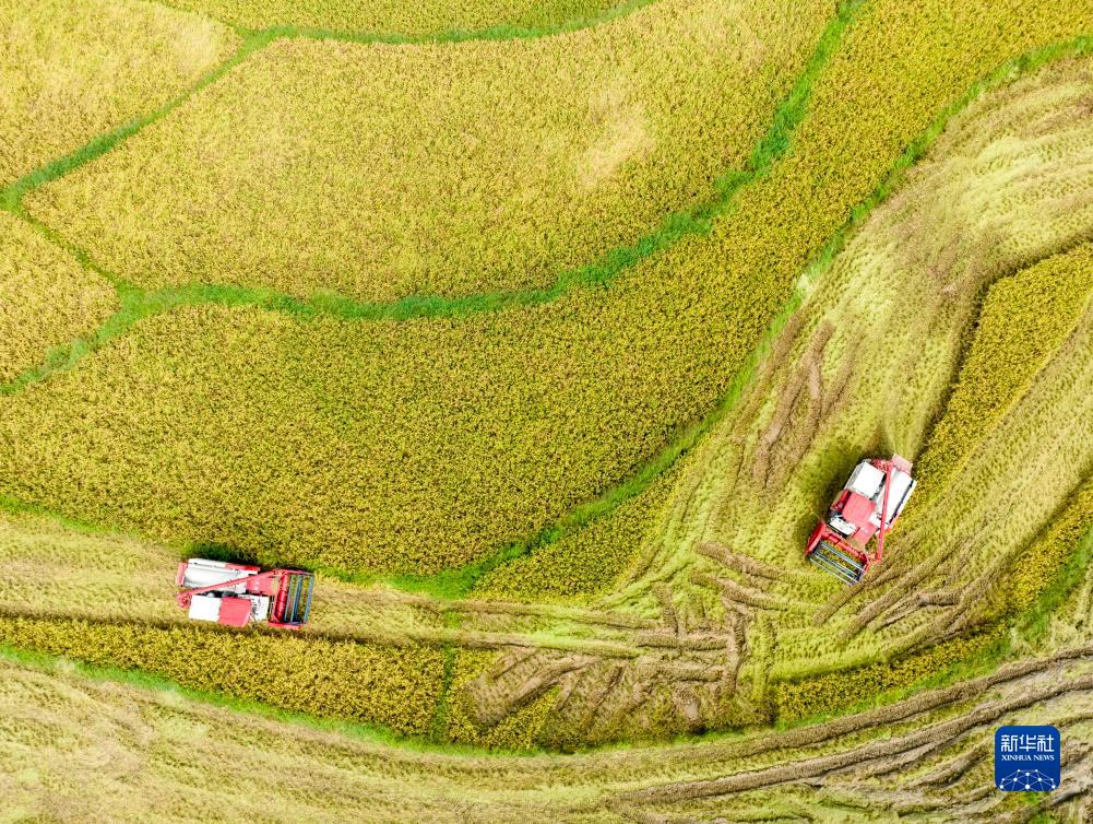 7月10日,在湖南省永州市道縣四馬橋鎮金獅庵村,農民駕駛農機在田間收割早稻(無(wú)人機照片)。