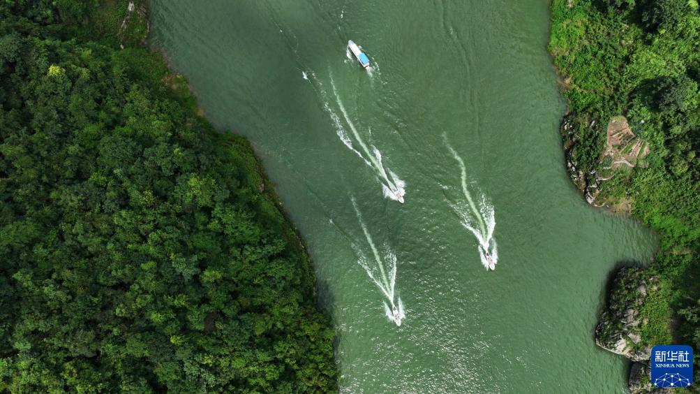 7月11日,游客在貴州省遵義市播州區楠木渡景區乘快艇游覽(無(wú)人機照片)。