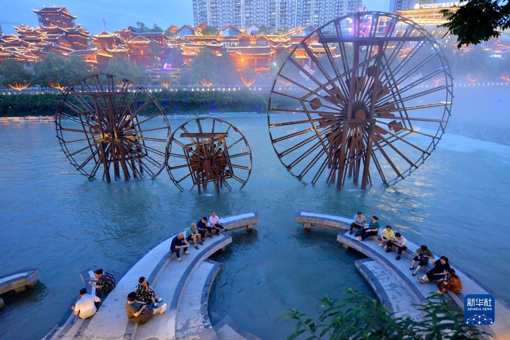 7月10日晚,市民和游客在宣恩縣城貢水河畔親水游玩。