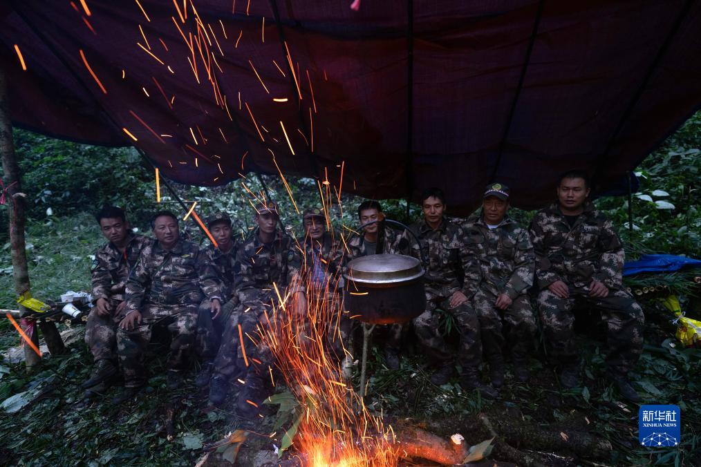 7月8日,在高黎貢山國家自然保護區,巡護隊員李加華、何貴品、勒利付、阿華利、張全、周?chē)鴤?、普三材、歐學(xué)軍、施建雄(從左至右)坐在篝火旁合影。新華社記者 費茂華 攝
