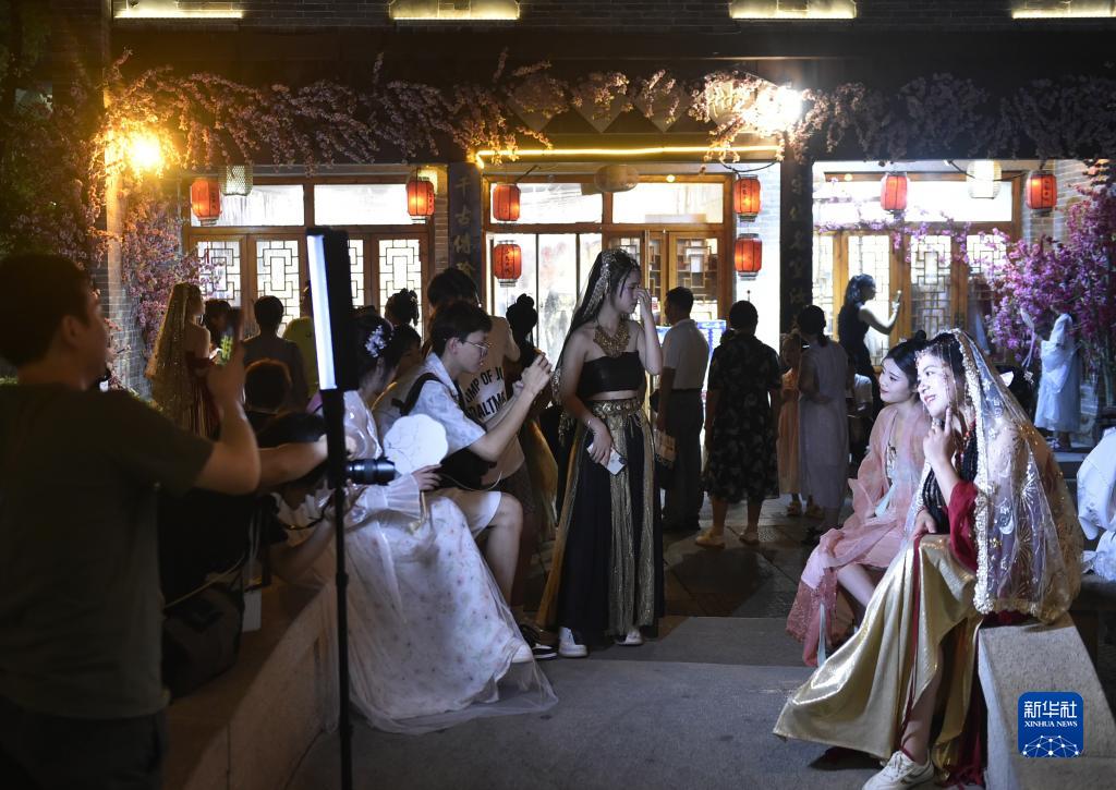 7月11日晚,游人在洛陽(yáng)市洛邑古城景區內游覽拍照。