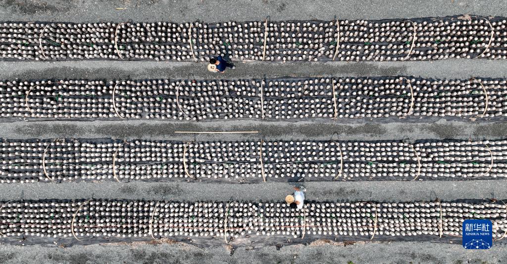 7月11日,在內蒙古扎蘭屯市扎蘭屯黑木耳產(chǎn)業(yè)孵化園區內,工作人員在采摘黑木耳(無(wú)人機照片)。