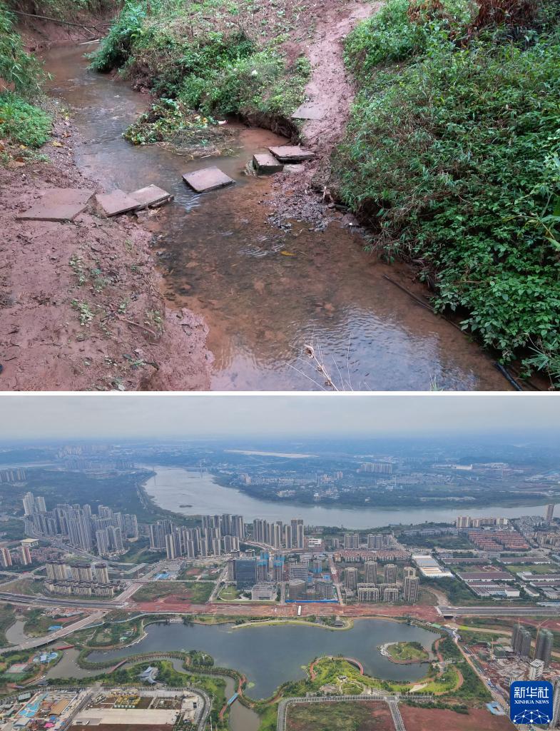 拼版照片:上圖為整治前的瀘州漁子溪(局部)(瀘州北控環(huán)保工程投資有限公司供圖),下圖為2023年6月1日拍攝的漁子溪濕地公園全景(無(wú)人機照片,新華社記者劉坤攝)。
