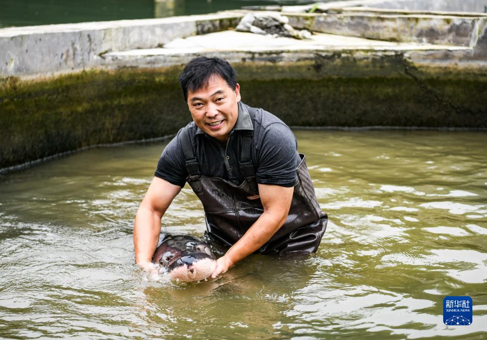 在宜賓珍稀水生動(dòng)物研究所富興繁育基地,周亮查看中華鱘的成熟情況(2021年10月12日攝)。新華社記者 王曦 攝