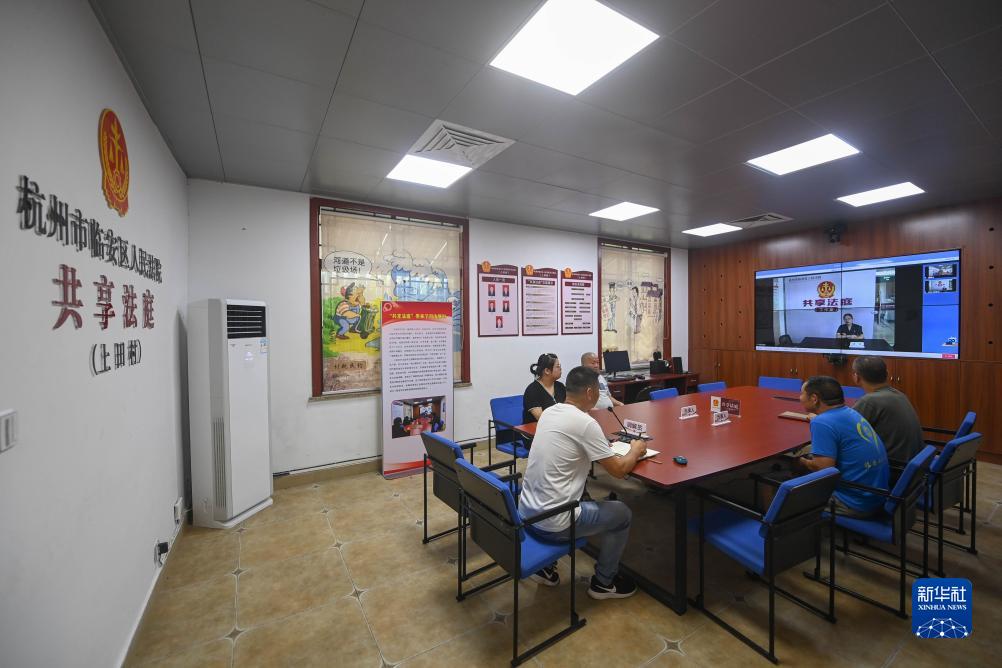 7月13日,在杭州市臨安區板橋鎮上田村“共享法庭”,工作人員連線(xiàn)臨安區法院調解處理一起鄰里糾紛案件。