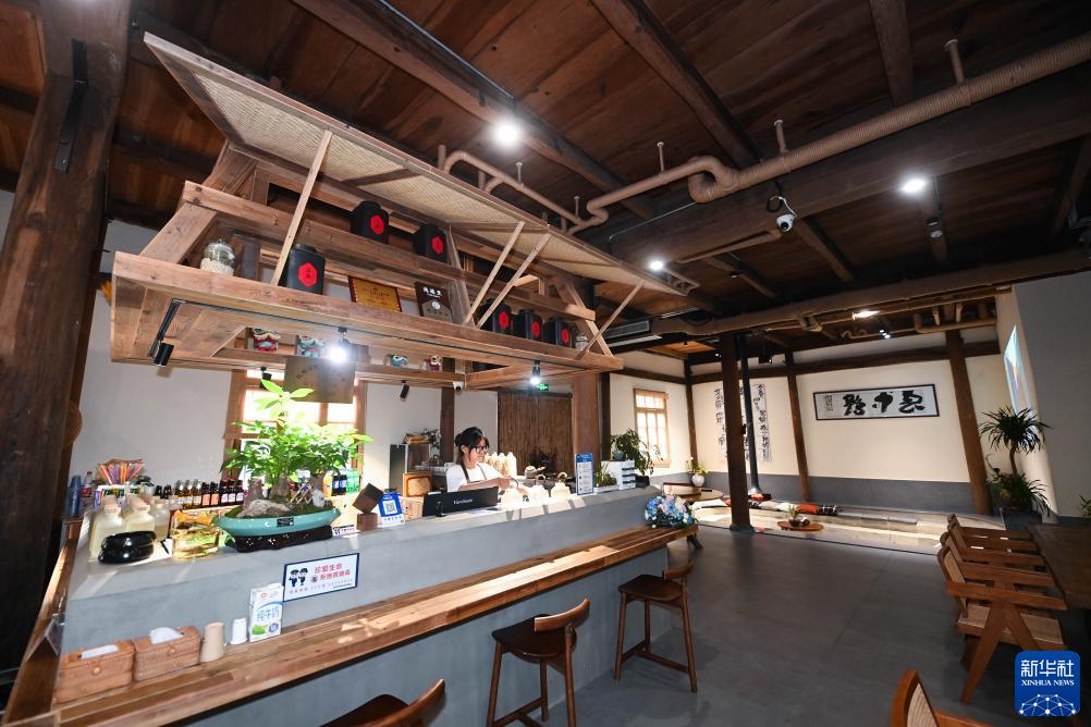 7月13日,在湍口鎮湍源里民宿里上班的村民在整理吧臺。這個(gè)由閑置糧倉和村民舊居改造而成的民宿由當地新鄉賢出資打造并經(jīng)營(yíng),為村集體增加租金收入300萬(wàn)元,帶動(dòng)100余人次就業(yè)。