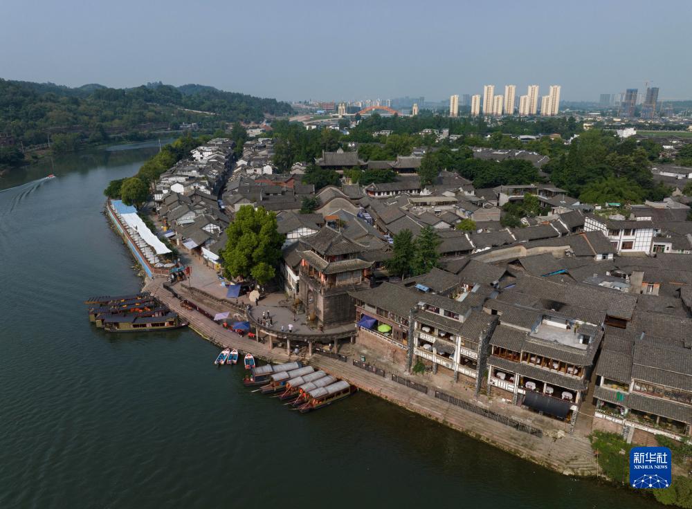俯瞰黃龍溪古鎮碼頭(6月24日攝,無(wú)人機照片)。黃龍溪古鎮是錦江流出成都的出境地,作為國家4A級旅游景區,黃龍溪古鎮臨水而興,黃龍溪親水是不少成都市民在節假日青睞的游玩方式。2016年,黃龍溪斷面水質(zhì)是劣Ⅴ類(lèi),如今,已經(jīng)達到了Ⅲ類(lèi)。新華社記者 江宏景攝
