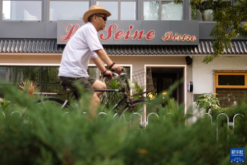 這是一名市民騎車(chē)經(jīng)過(guò)北京亮馬河畔一家名叫“塞納河”的西餐廳(6月25日攝)。