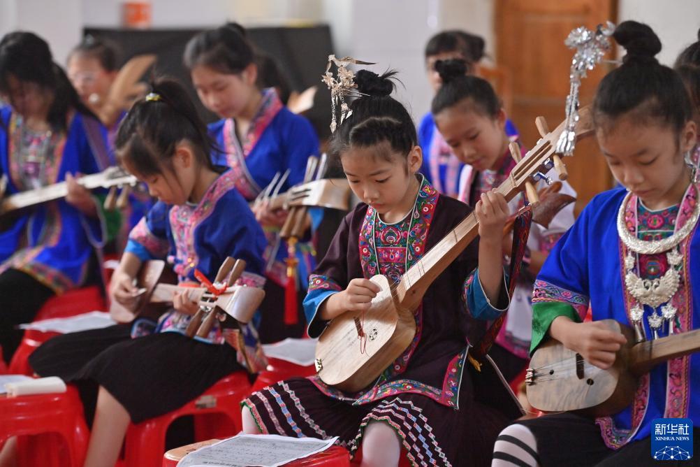 7月13日,在廣西三江侗族自治縣文化館,小學(xué)生在學(xué)習彈唱侗族琵琶歌。