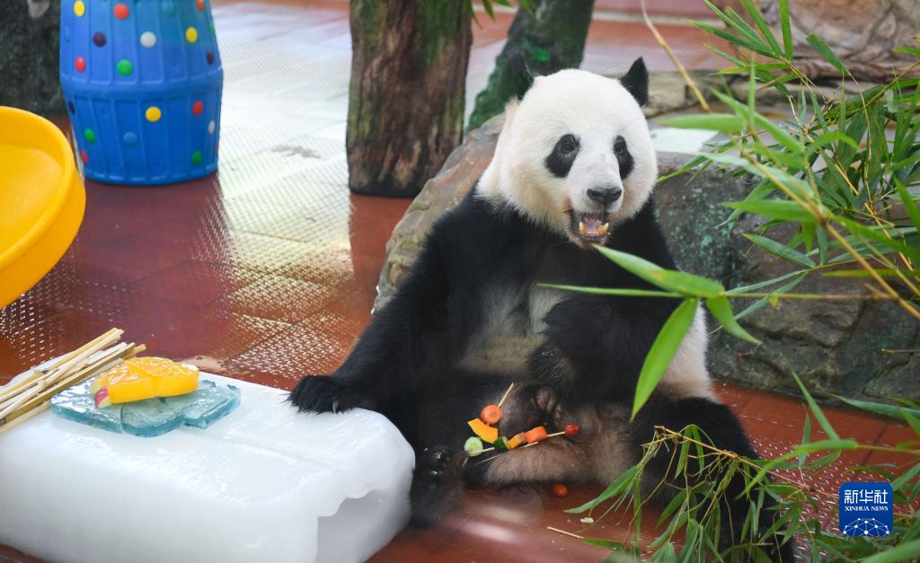 7月13日,廣州動(dòng)物園里的熊貓星一在空調房里玩耍。