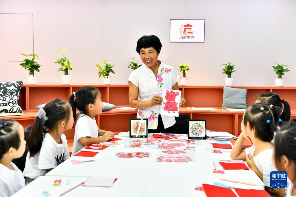 7月13日,在惠民縣姜樓鎮一處“濱濱學(xué)堂”,公益講師張士翠教孩子們剪紙。