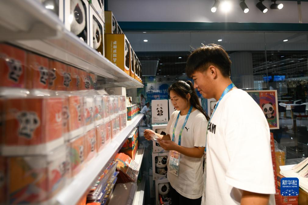 7月14日,媒體工作人員在成都大運會(huì )主媒體中心大運會(huì )官方特許商品零售店內選購紀念品。
