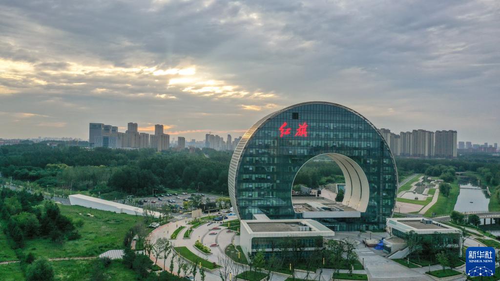 7月13日無(wú)人機拍攝的晨曦中的一汽紅旗創(chuàng )新大廈。