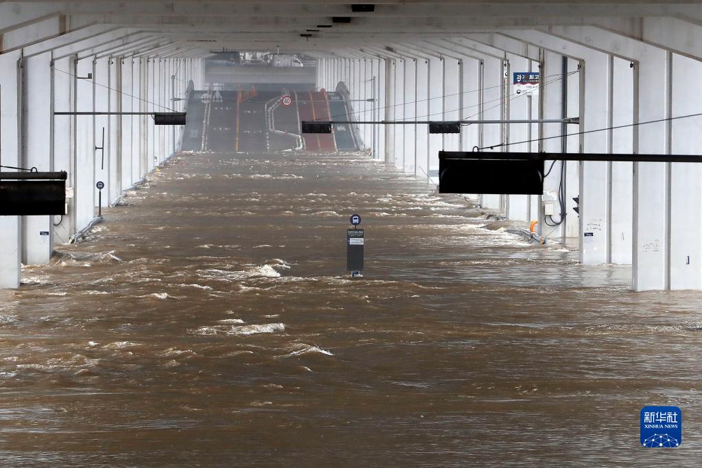 這是7月14日在韓國首爾拍攝的被水淹沒(méi)的潛水橋。