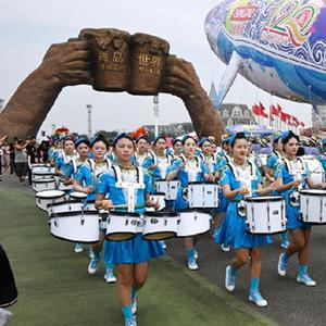 7月14日,少女儀仗隊帶領(lǐng)游客進(jìn)入金沙灘啤酒城。