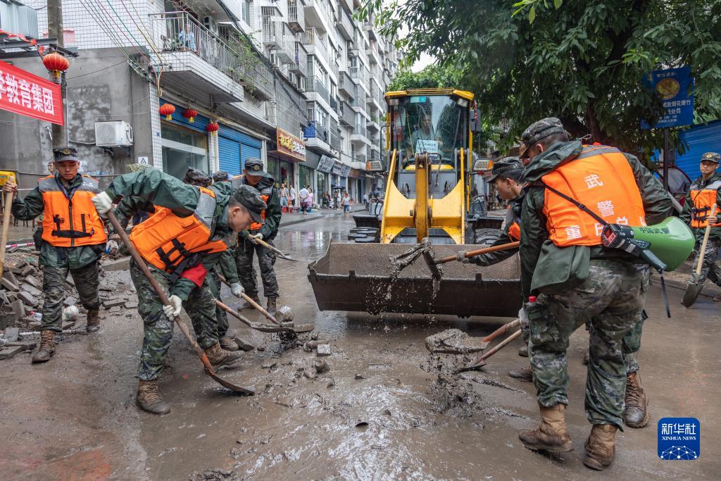 7月14日,在重慶市萬(wàn)州區五橋街道五間橋社區,武警重慶總隊船艇支隊官兵在洪水退去后清淤。