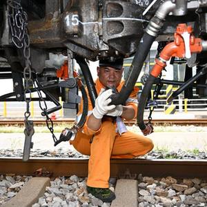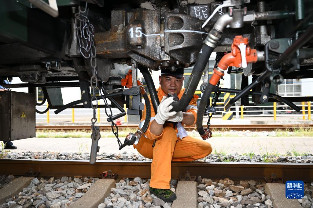 7月13日,合肥火車(chē)站運轉車(chē)間調車(chē)長(cháng)李健在連接調車(chē)機車(chē)與車(chē)輛制動(dòng)軟管。