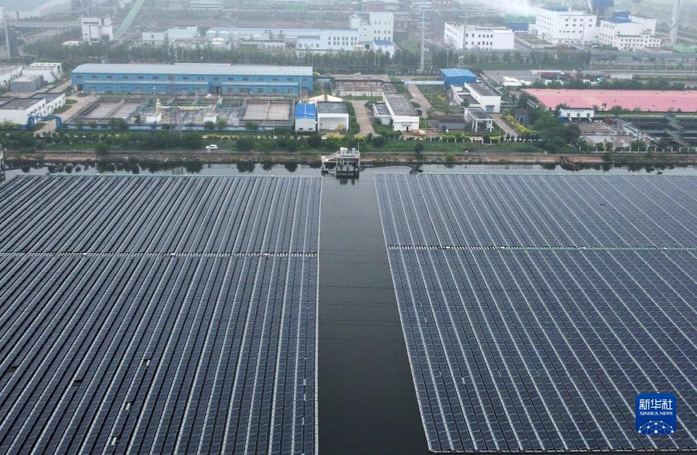 這是7月13日拍攝的天津榮程聯(lián)合鋼鐵集團有限公司“漁光互補”分布式光伏發(fā)電項目(無(wú)人機照片)。