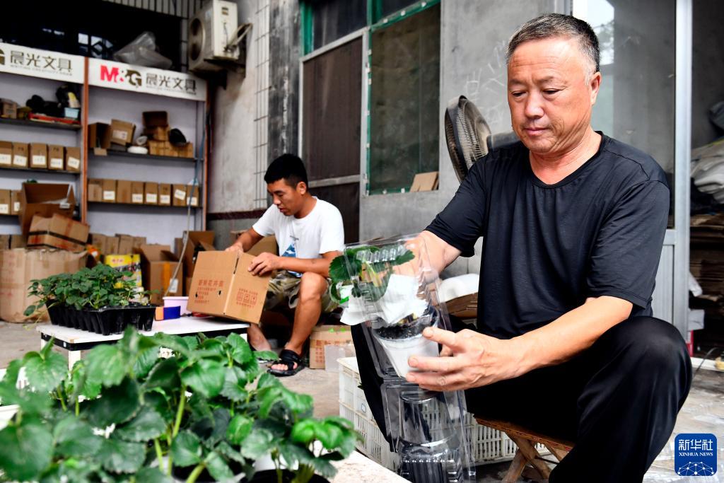 7月14日,在惠民縣石廟鎮柳編彭村,村民打包草莓苗,準備發(fā)快遞物流。