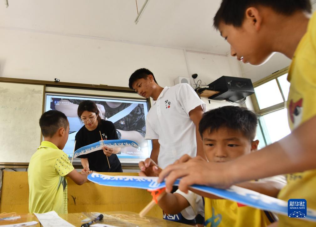 7月14日,在三江侗族自治縣知了小學(xué),南通大學(xué)學(xué)生在給孩子們上“夢(mèng)想課堂”。
