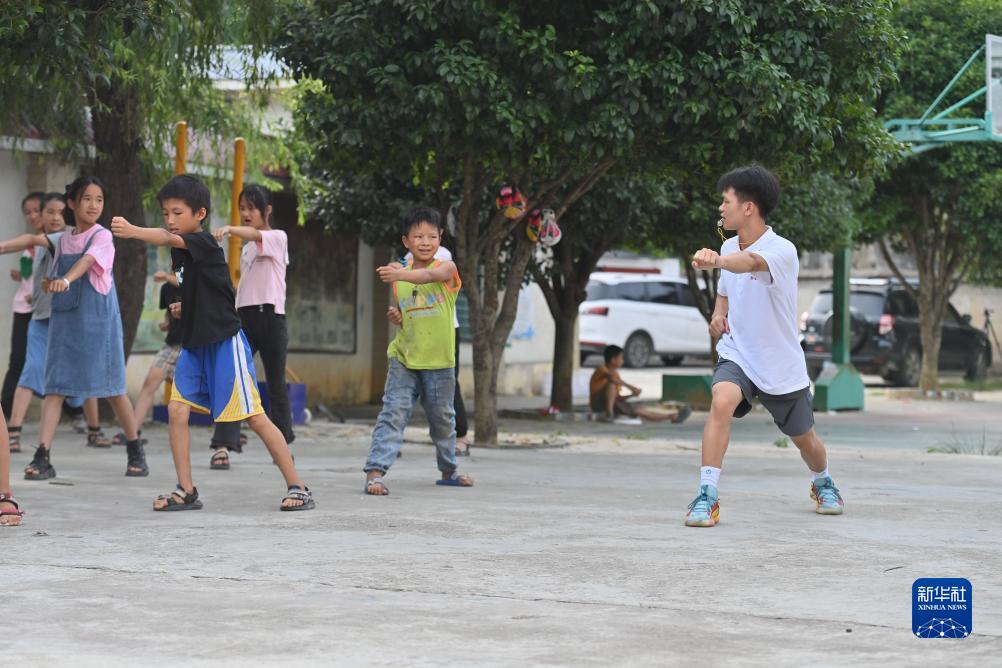 7月14日,在三江侗族自治縣知了小學(xué),南通大學(xué)學(xué)生教孩子們學(xué)習武術(shù)。