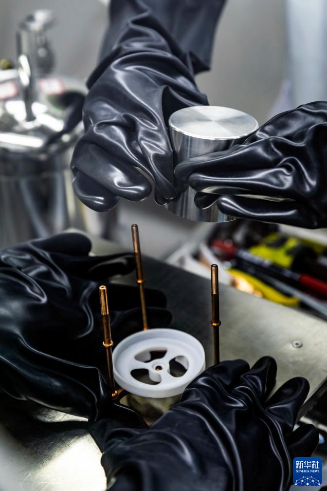 7月3日,在中國錦屏地下實(shí)驗室,實(shí)驗組成員利用模擬裝置,訓練裝配1公斤級高純鍺探測器,為開(kāi)展第三代百公斤級高純鍺暗物質(zhì)實(shí)驗做準備。新華社記者 沈伯韓 攝